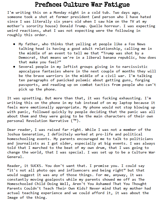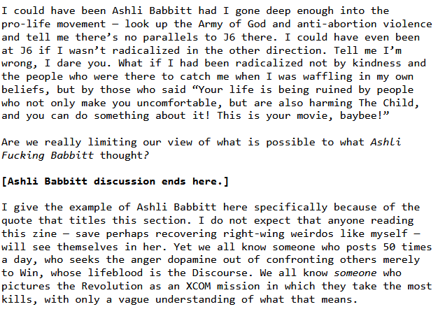 You will probably disagree with or get upset with me in parts. That's ok. Come back to it whenever you want to, the zine will still be here.