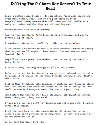 I wrote So You Want To Be A Culture War General in 2024, two months before the US general election. I was tired, I was angry, and I was so very done with seeing people post panicked polemic without caring for the well-being of those around them simply because they wanted to be More Correct Than Everyone Else (tm).